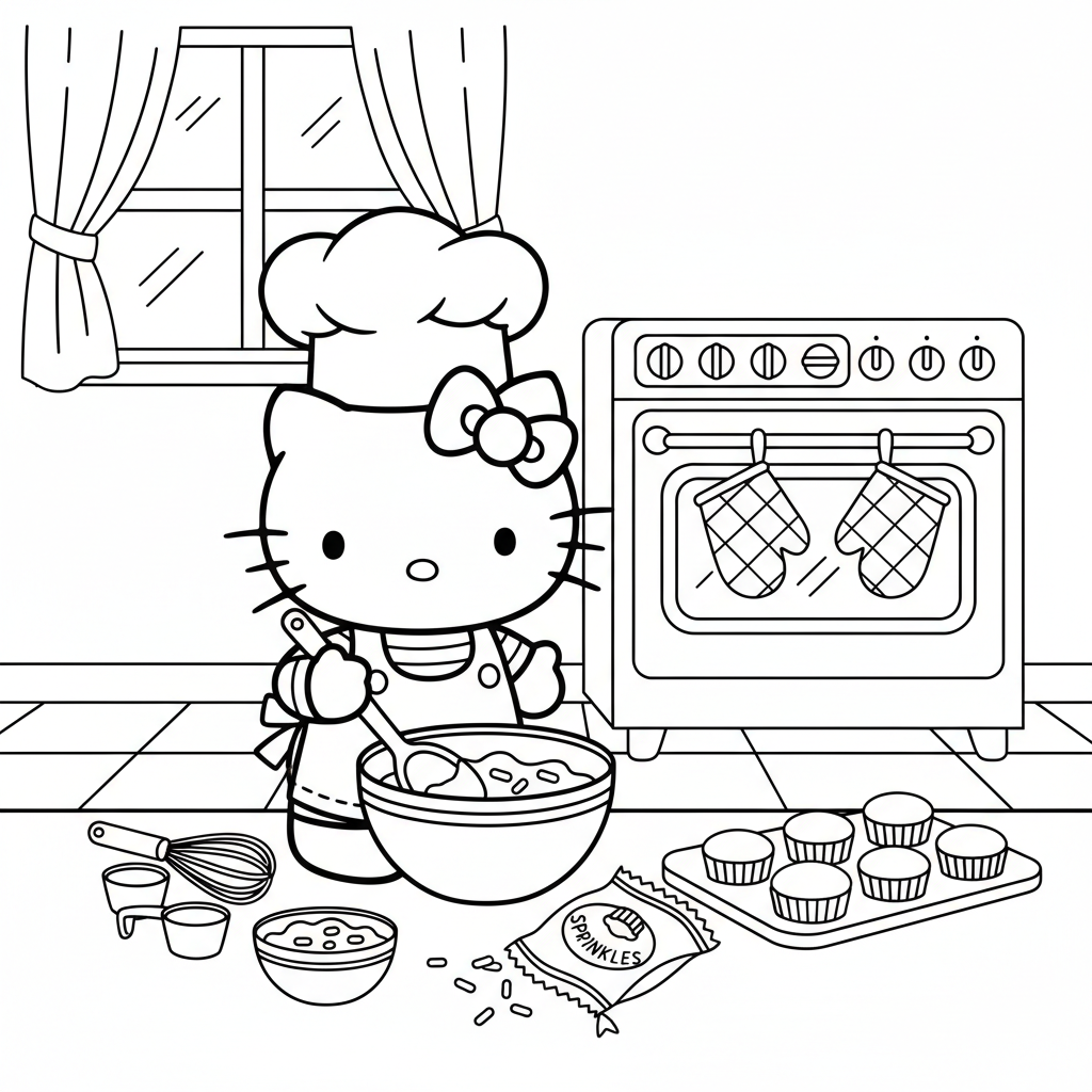 Color Hello Kitty in her chef's hat, baking cupcakes with sprinkles! Perfect for young fans of baking and Hello Kitty.