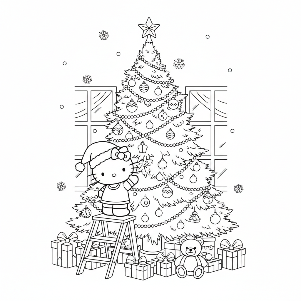 A delightful coloring page featuring Hello Kitty decorating a Christmas tree, surrounded by gifts and a teddy bear. Perfect for kids and fans of cute characters!