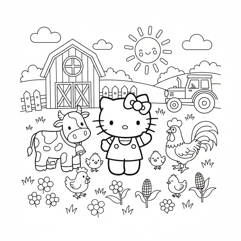 Color Hello Kitty on a charming farm with a barn, cow, rooster, chicks, and tractor under a smiling sun. Perfect for kids who love farm animals and cute characters!