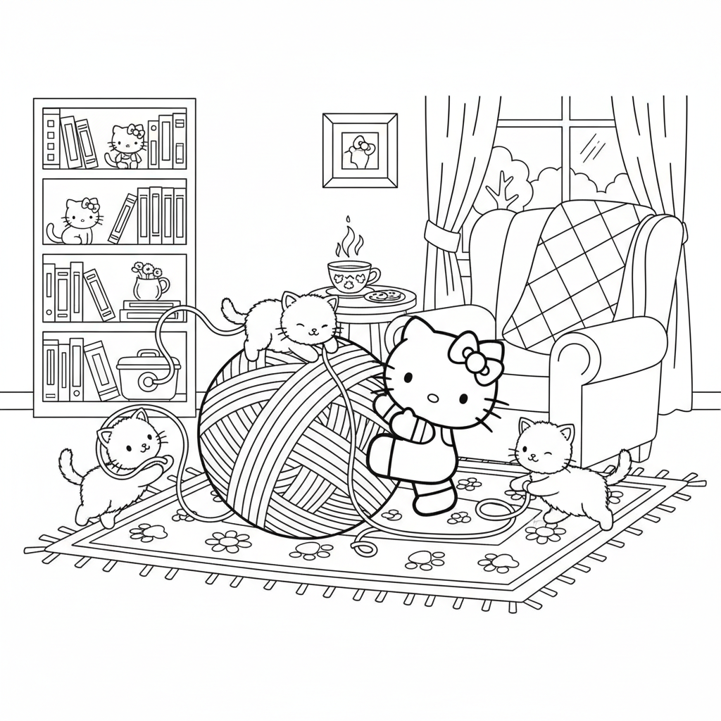 A super cute scene featuring Hello Kitty and playful kittens tangled up in a giant ball of yarn. Perfect for kids and Hello Kitty fans!