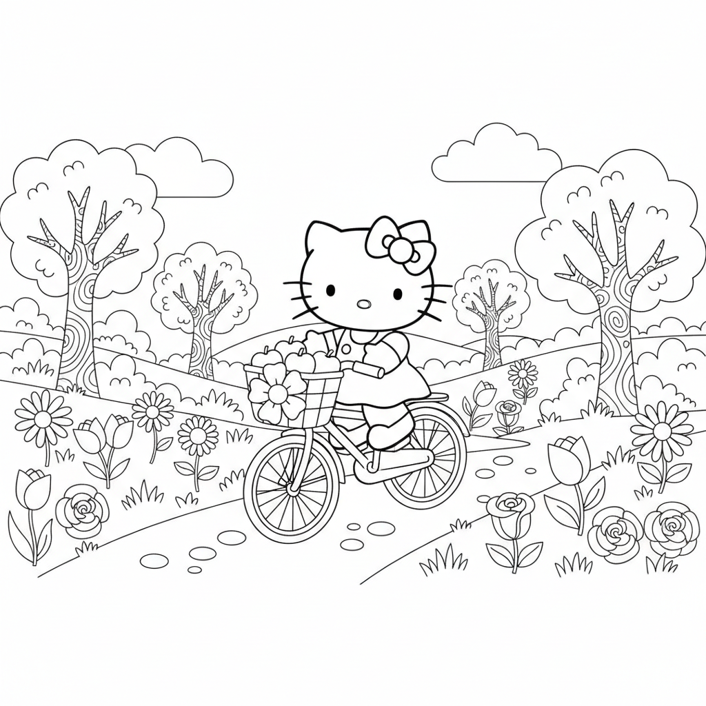 Color Hello Kitty riding her bicycle through a beautiful field of flowers and trees. Perfect for cat lovers and fans of nature scenes!