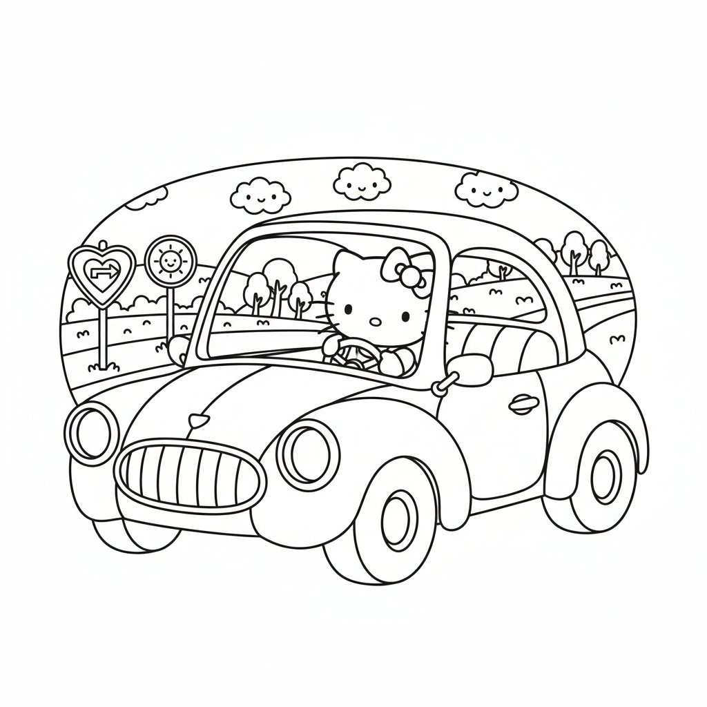 A charming coloring page featuring Hello Kitty driving a cute car through a scenic landscape with happy clouds. Perfect for fans of kawaii characters and vehicles!