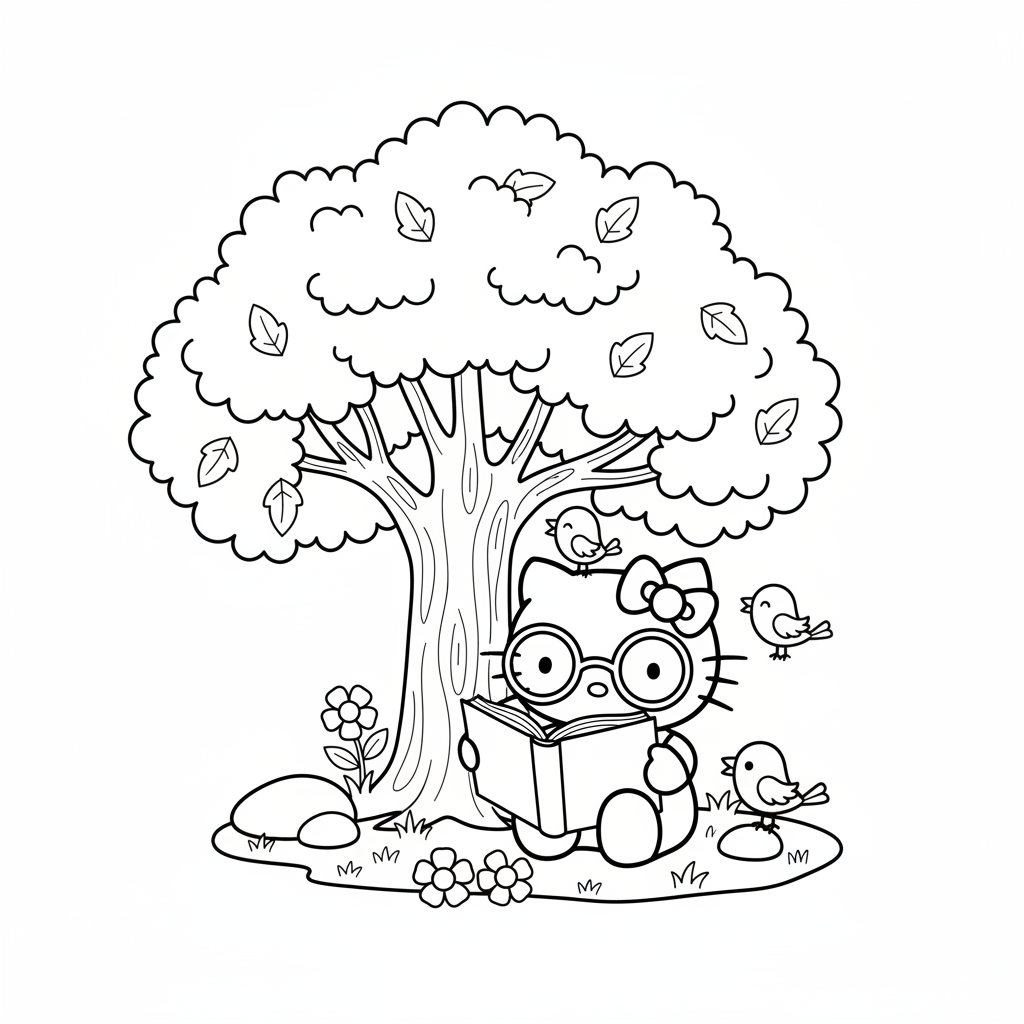 A super cute kitty with glasses reading under a big tree, surrounded by little birds and flowers. Perfect for young cat and nature lovers!