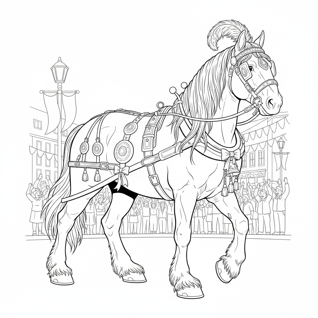 Beautiful clydesdale decorated for parade coloring page for kids and adults. Free to download and print.
