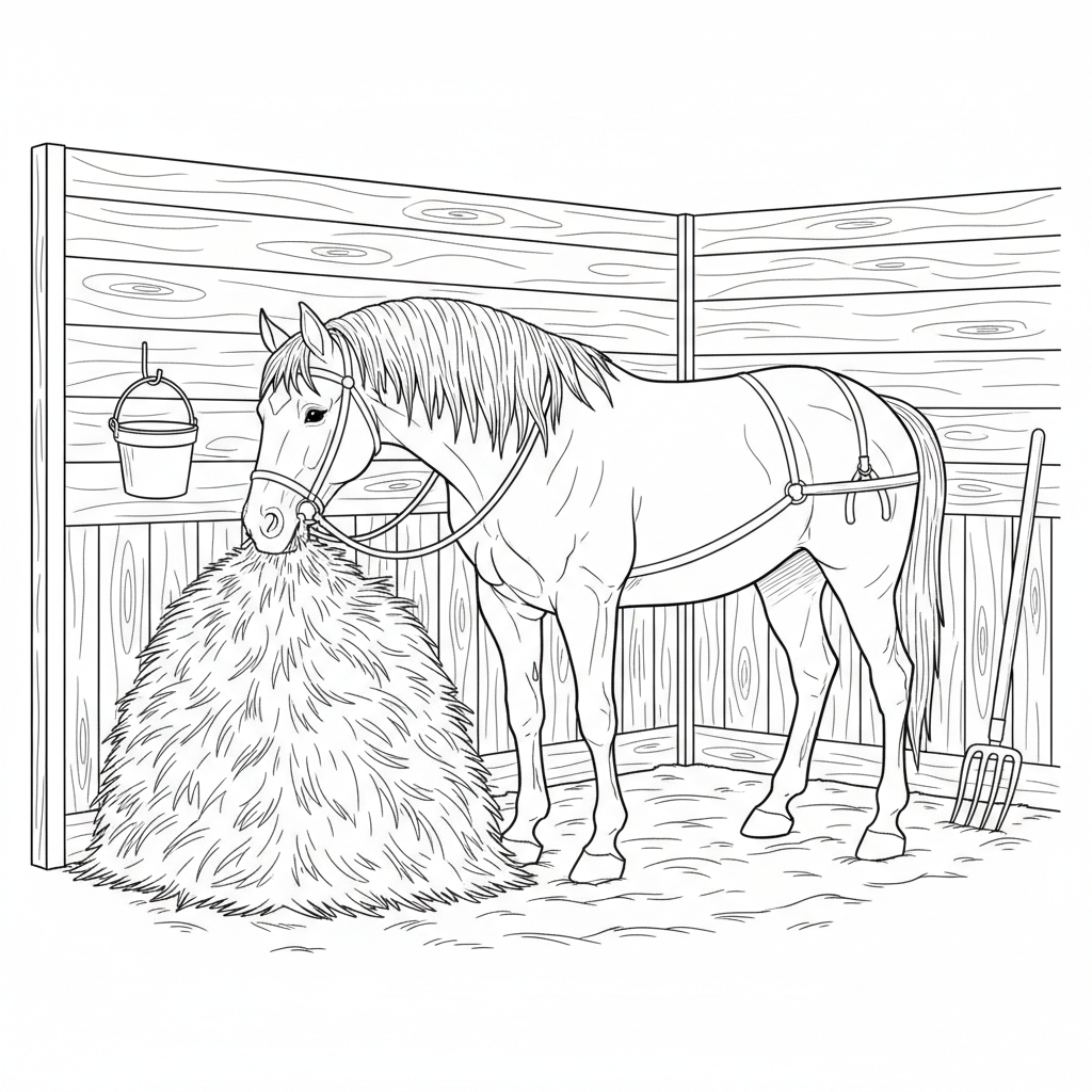 Beautiful horse in stable eating hay coloring page for kids and adults. Free to download and print.