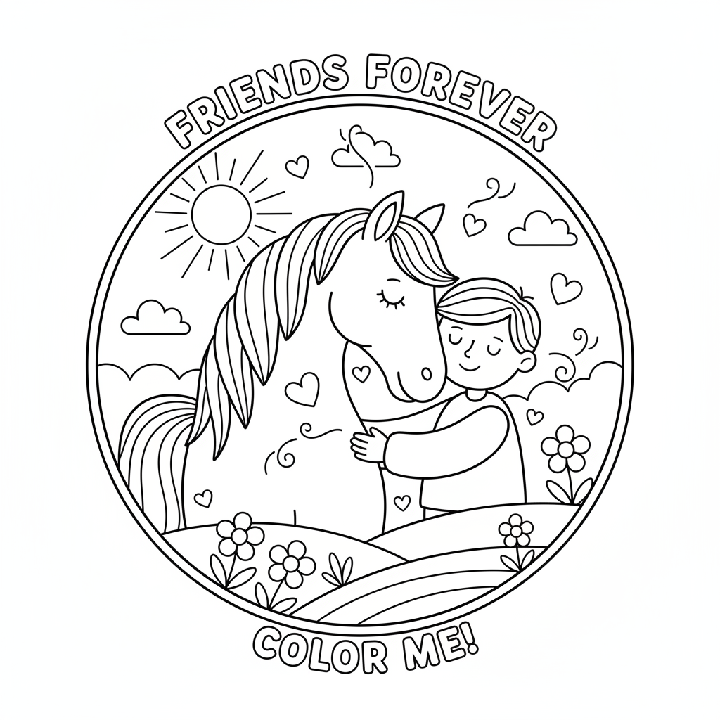 A delightful horse coloring page featuring horse nuzzling with owner affection bond. Perfect for kids and adults who love coloring!