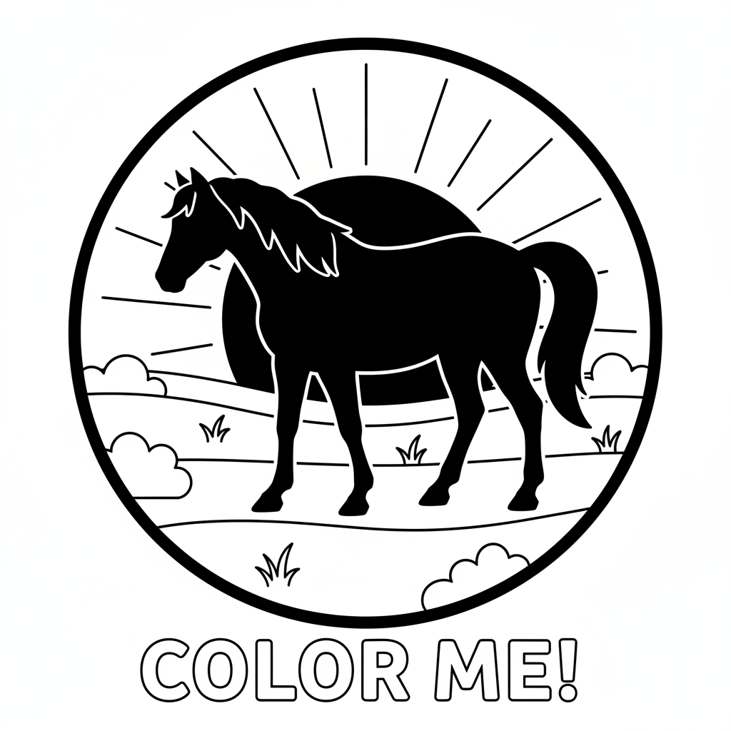 A delightful horse coloring page featuring horse standing in field sunset silhouette. Perfect for kids and adults who love coloring!