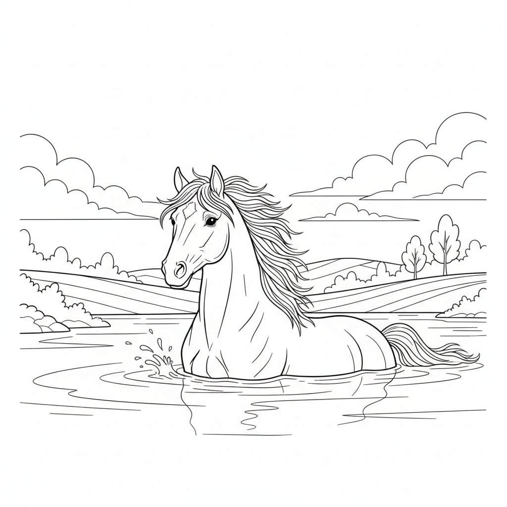 Beautiful horse swimming in lake coloring page for kids and adults. Free to download and print.