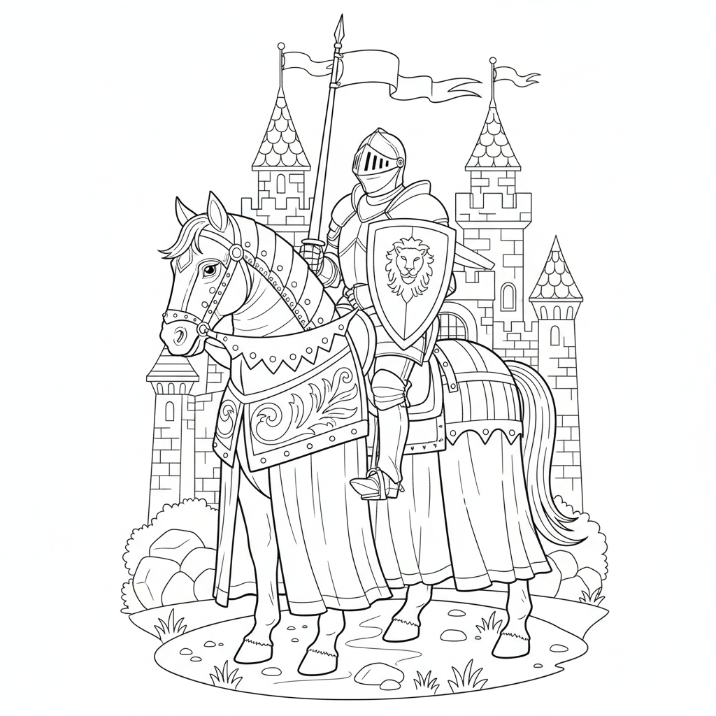 Beautiful knight on armored horse coloring page for kids and adults. Free to download and print.