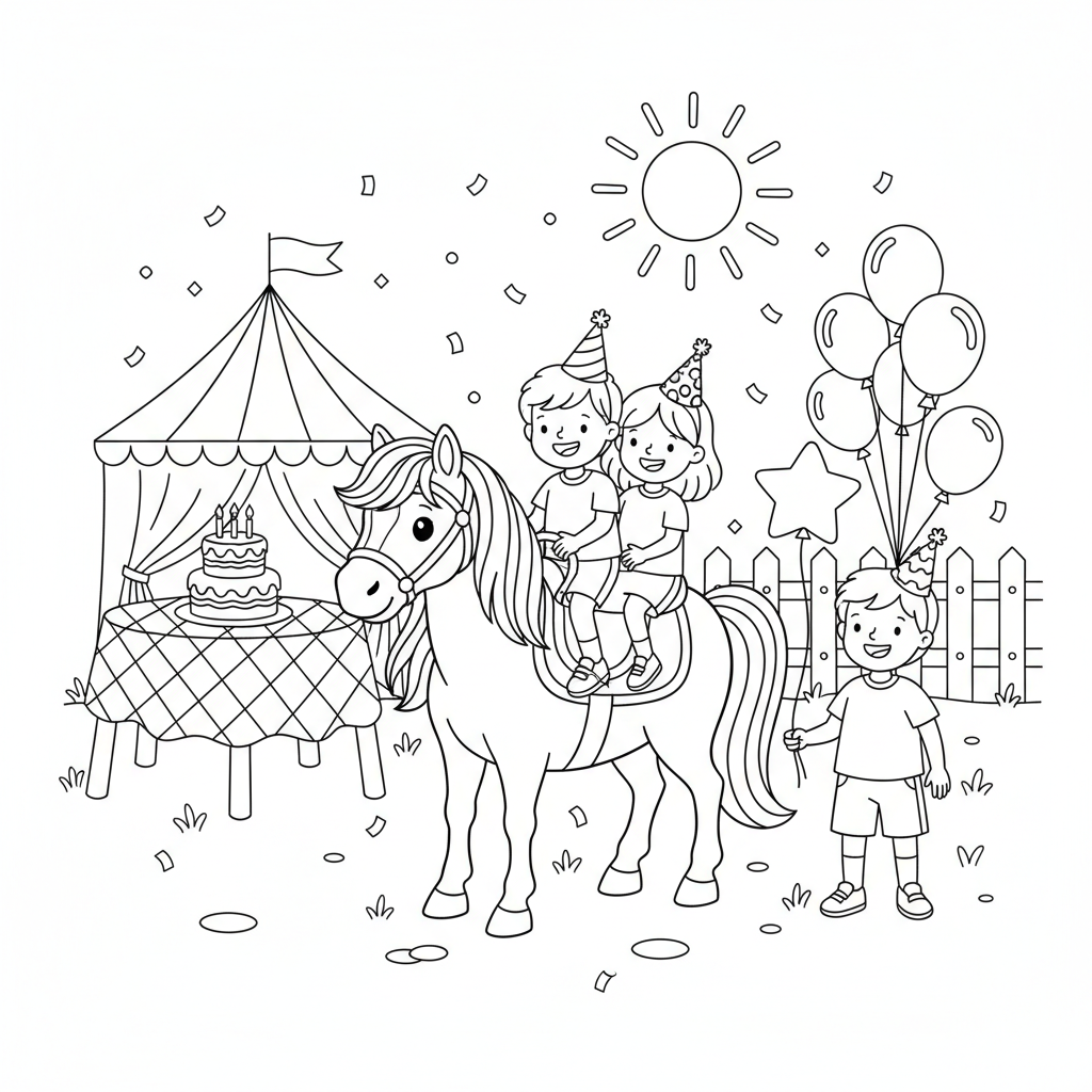 A delightful horse coloring page featuring pony at children's party giving rides. Perfect for kids and adults who love coloring!