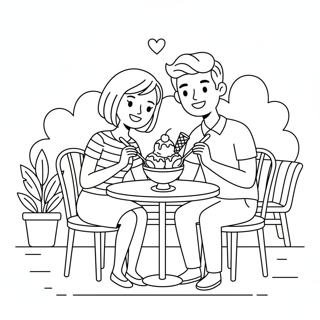 A delightful ice cream coloring page featuring ice cream date romantic couple sharing. Perfect for kids and adults who love coloring!