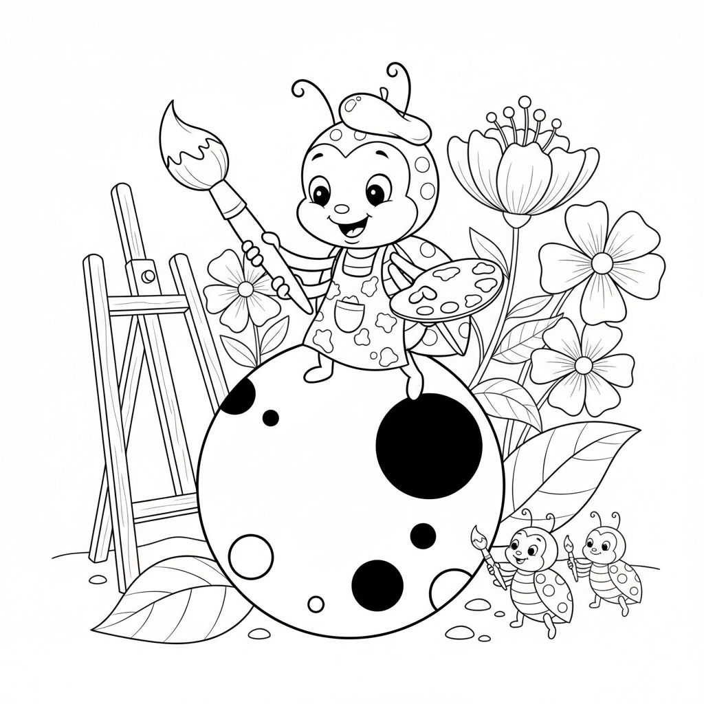 Beautiful ladybug artist painting spots coloring page for kids and adults. Free to download and print.