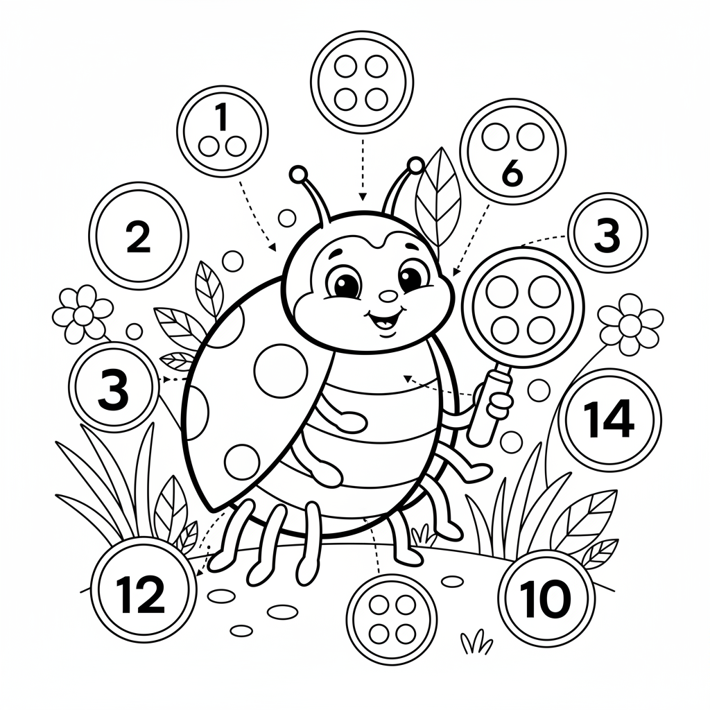 Beautiful ladybug counting spots game coloring page for kids and adults. Free to download and print.