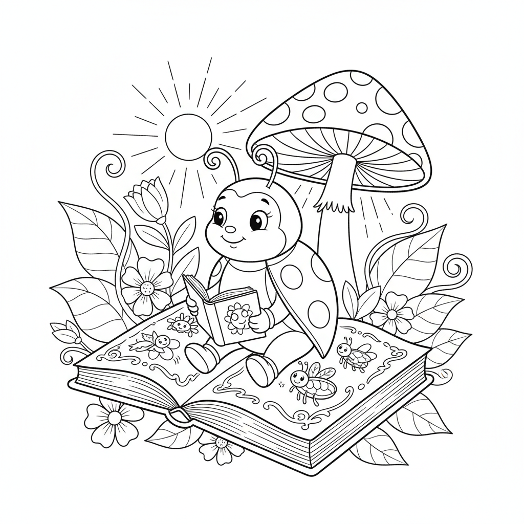 Beautiful ladybug reading story book coloring page for kids and adults. Free to download and print.