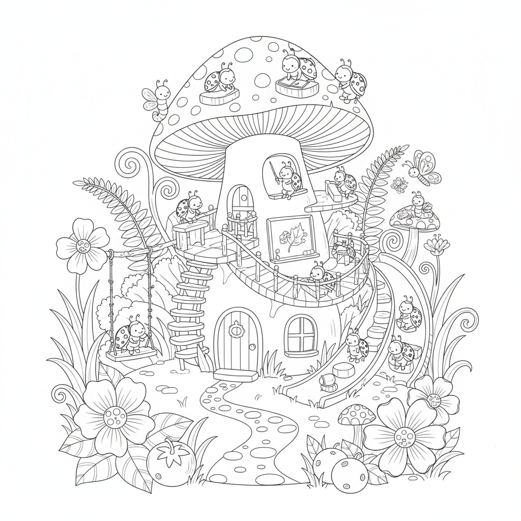 Beautiful ladybug school in garden coloring page for kids and adults. Free to download and print.