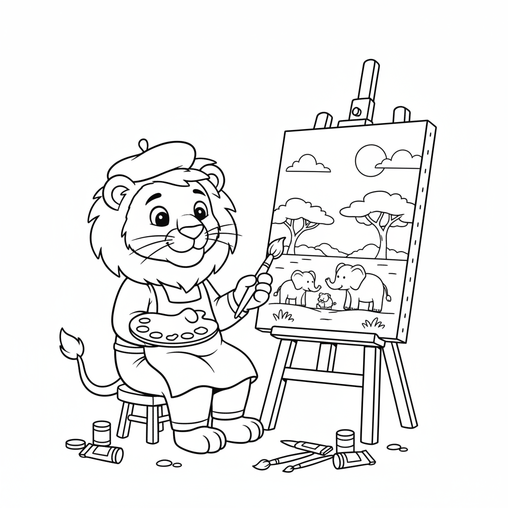 A delightful lion coloring page featuring lion artist painting savanna landscape creative canvas. Perfect for kids and adults who love coloring!