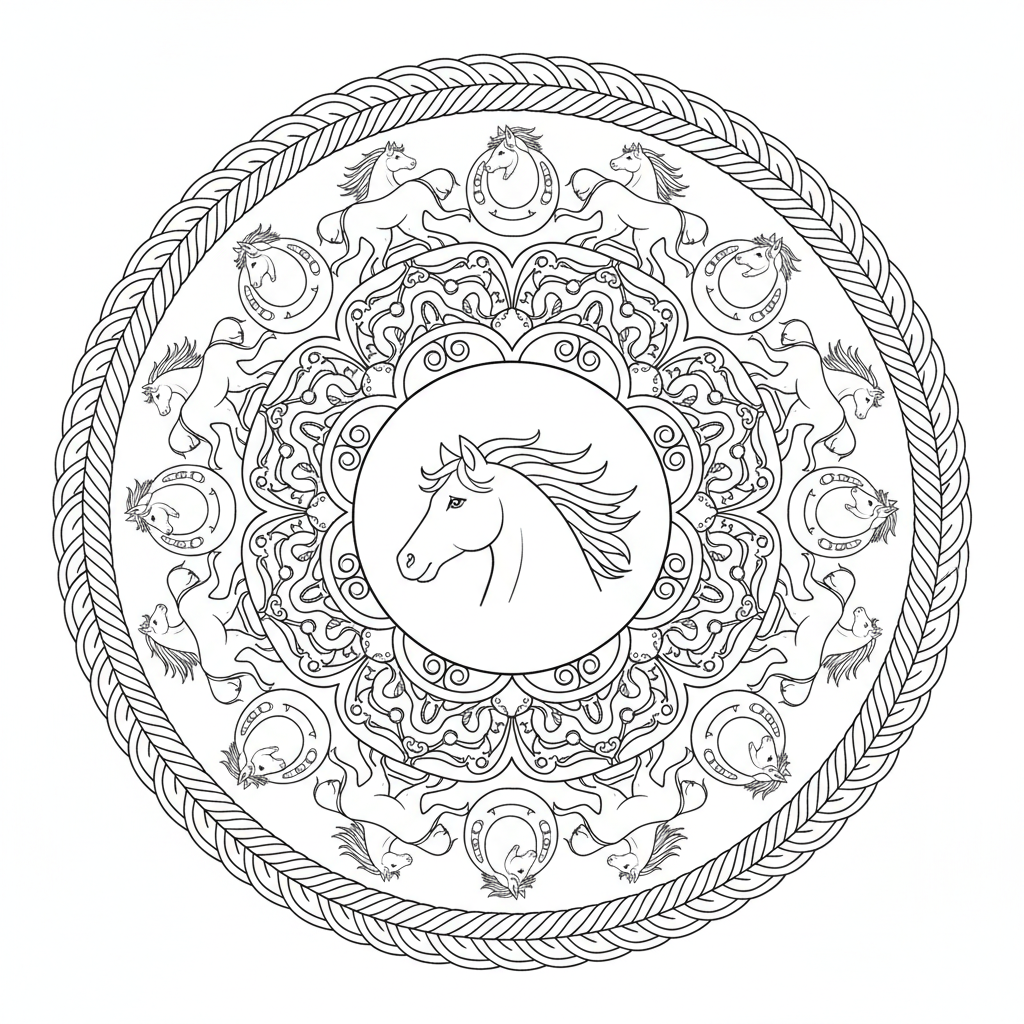 A delightful mandala coloring page featuring horse mandala equine themed pattern design. Perfect for kids and adults who love coloring!