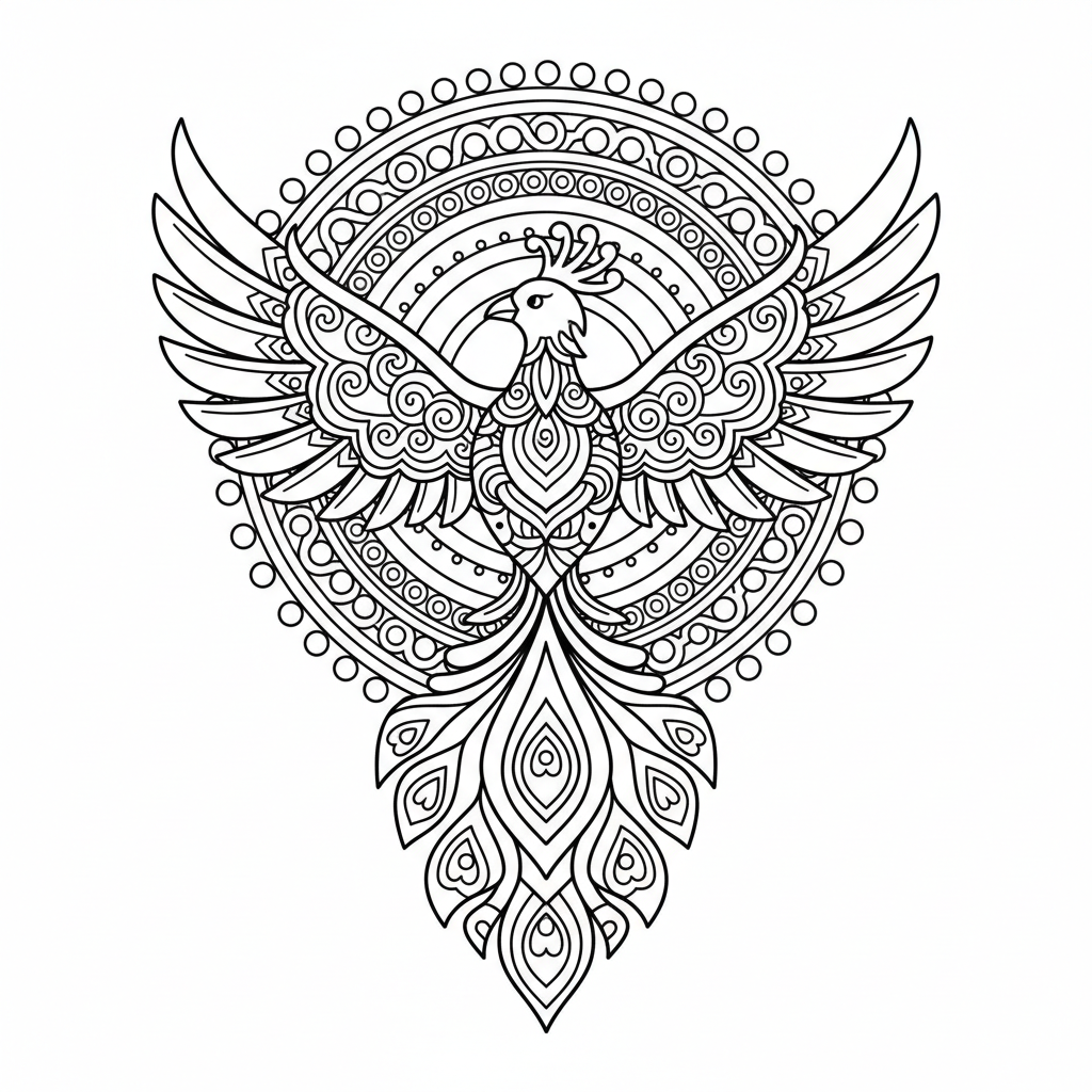A delightful mandala coloring page featuring phoenix mandala fire bird rising mythical. Perfect for kids and adults who love coloring!