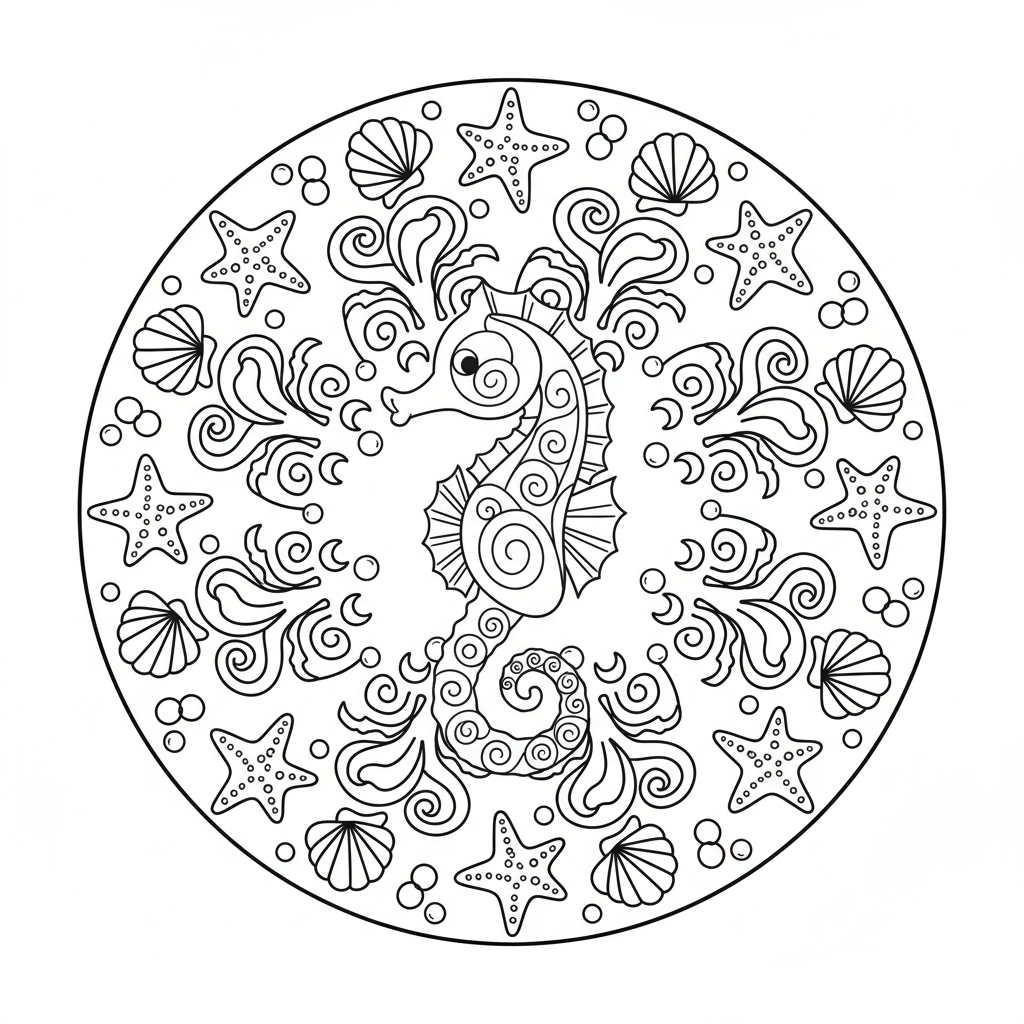 A delightful mandala coloring page featuring seahorse mandala ocean themed underwater pattern. Perfect for kids and adults who love coloring!