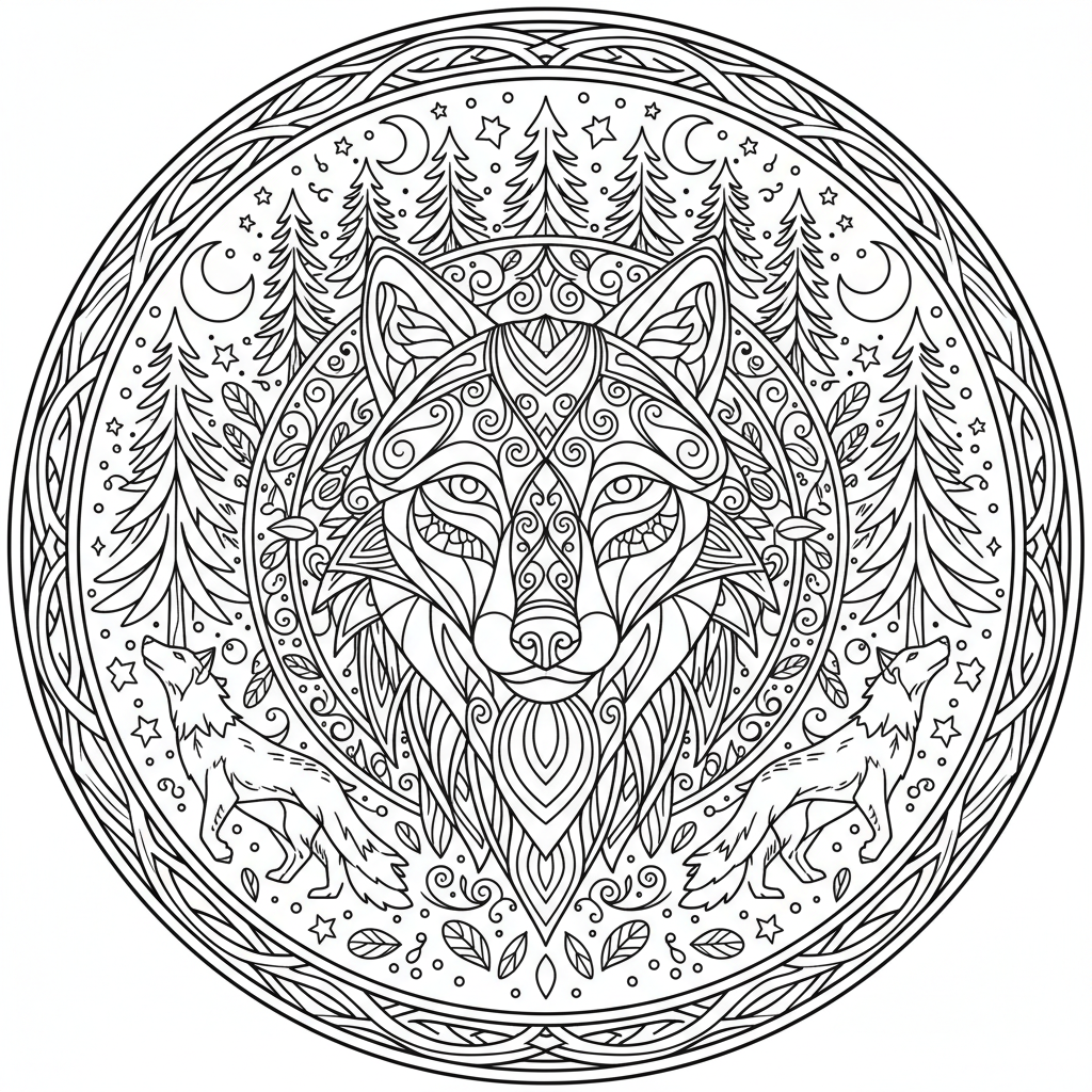 A delightful mandala coloring page featuring wolf mandala spirit animal forest design. Perfect for kids and adults who love coloring!