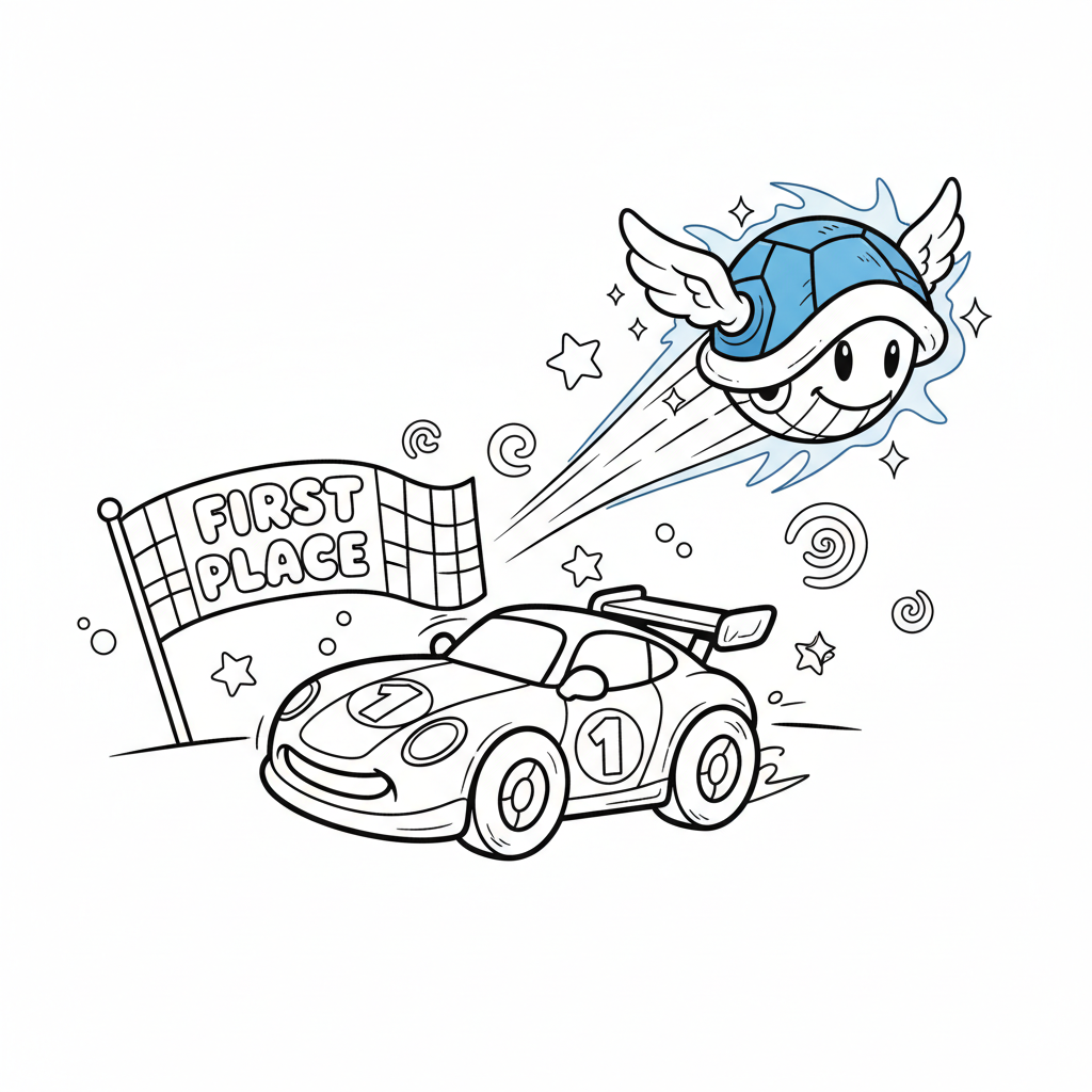 An original AI-generated fan art coloring page inspired by mario kart, featuring a magical blue shell flying overhead targeting first place racer. This is unofficial fan art, not affiliated with the original creators. Perfect for kids and adults who love coloring!