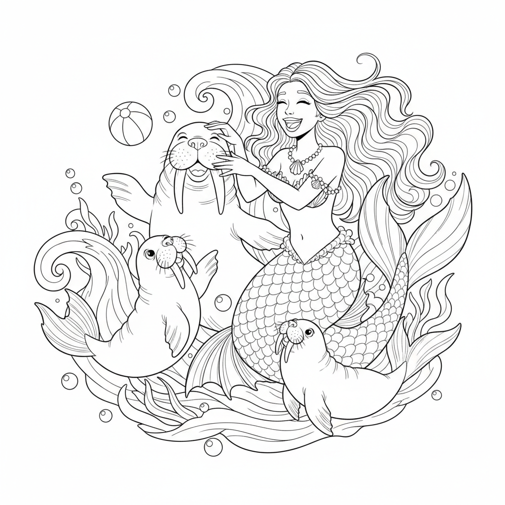 A joyful mermaid playing with walruses and baby seals in the ocean. Perfect for kids and mermaid lovers looking for an aquatic adventure to color!