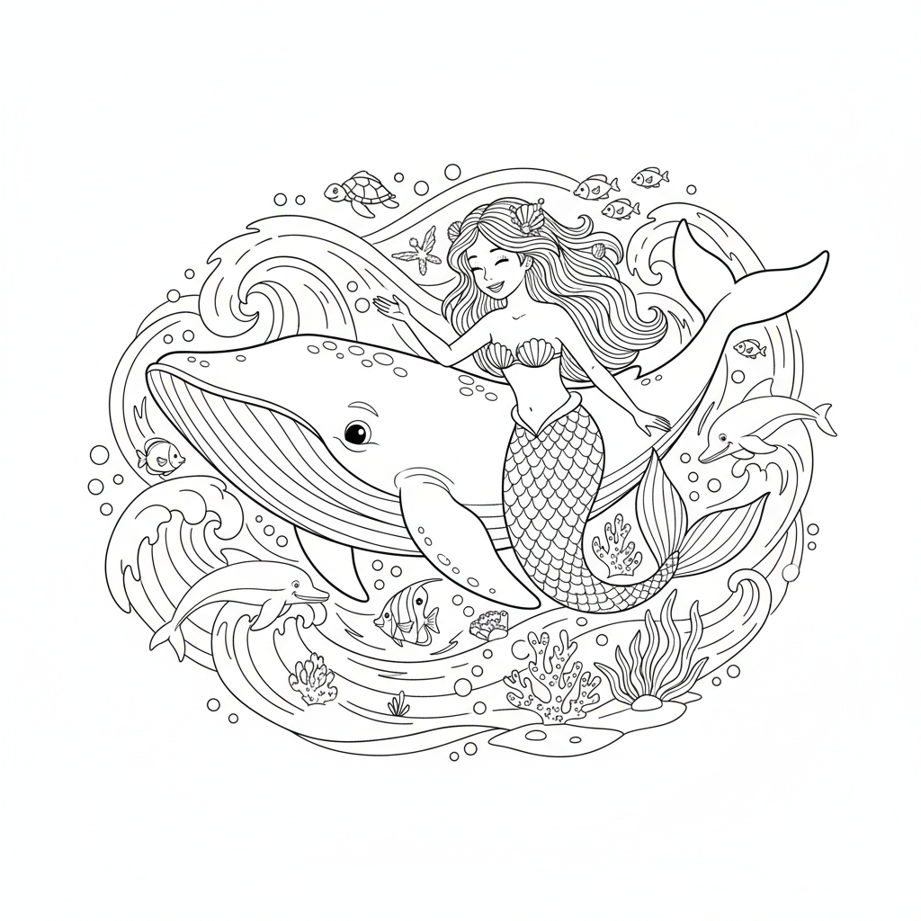 Beautiful mermaid and whale friendship coloring page for kids and adults. Free to download and print.