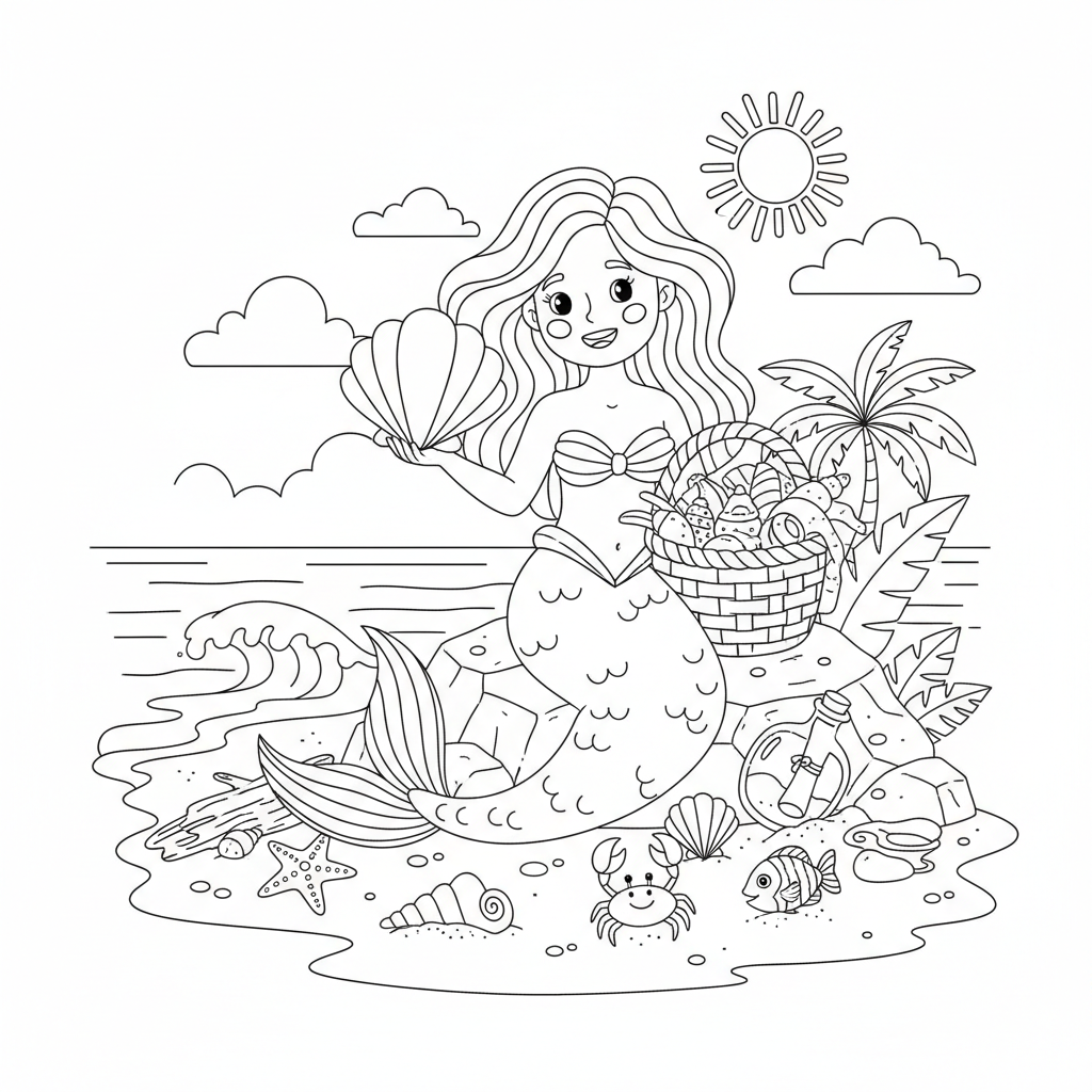A delightful mermaid coloring page featuring mermaid collecting seashells beach treasures. Perfect for kids and adults who love coloring!