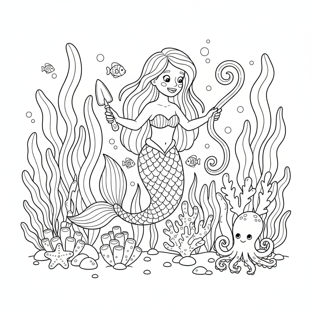 A delightful mermaid coloring page featuring mermaid garden kelp forest tending sea plants. Perfect for kids and adults who love coloring!