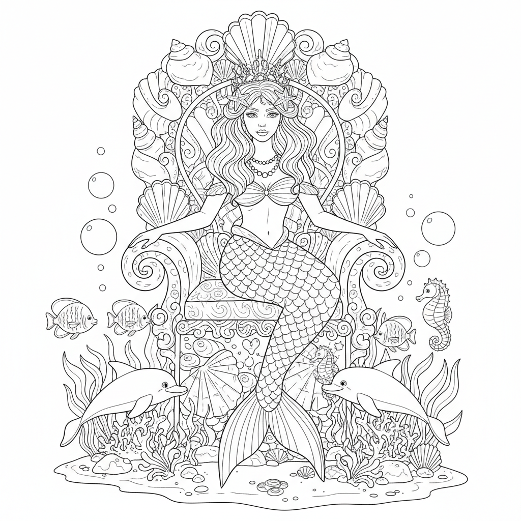 Beautiful mermaid queen on shell throne coloring page for kids and adults. Free to download and print.