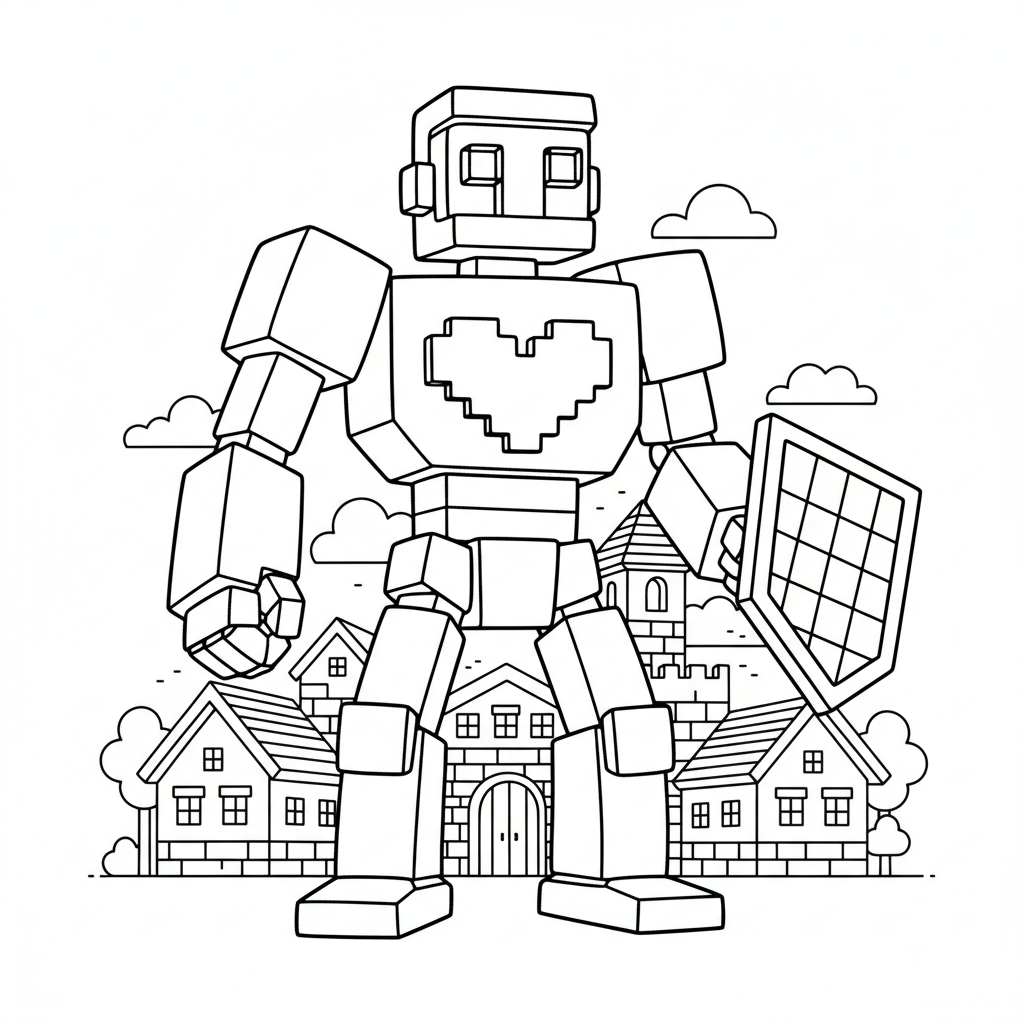 An original AI-generated fan art coloring page inspired by minecraft, featuring a large iron pixel golem protecting village strong guardian. This is unofficial fan art, not affiliated with the original creators. Perfect for kids and adults who love coloring!