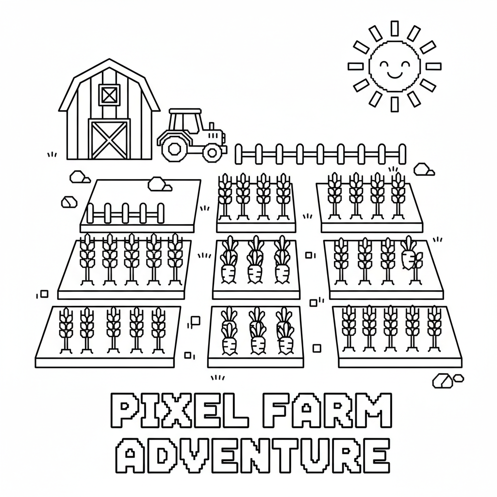 An original AI-generated fan art coloring page inspired by minecraft, featuring a pixel farm with crops wheat carrots growing in rows. This is unofficial fan art, not affiliated with the original creators. Perfect for kids and adults who love coloring!