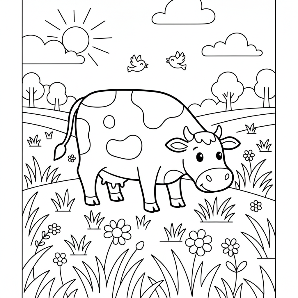 A delightful minecraft coloring page featuring cow grazing in grassy meadow peaceful. Perfect for kids and adults who love coloring!