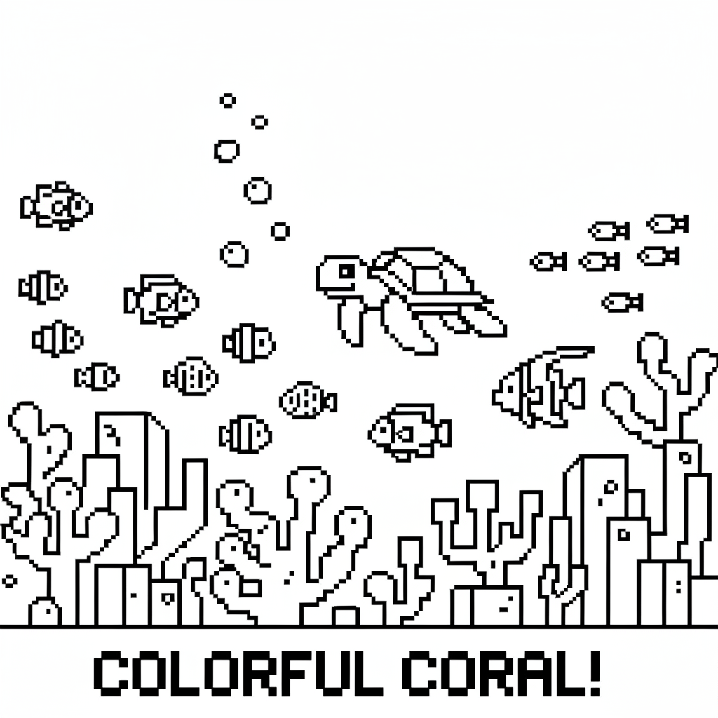 An original AI-generated fan art coloring page inspired by minecraft, featuring underwater pixel coral reef with colorful tropical fish. This is unofficial fan art, not affiliated with the original creators. Perfect for kids and adults who love coloring!