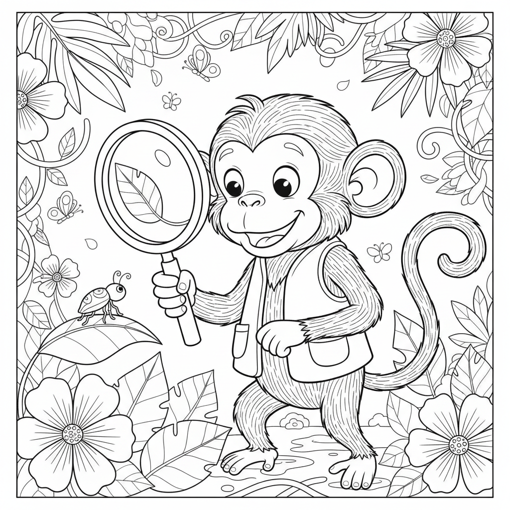 Beautiful curious monkey with magnifying glass coloring page for kids and adults. Free to download and print.