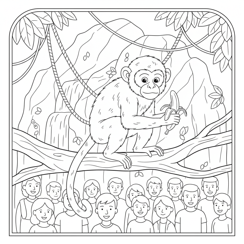 Beautiful monkey at zoo exhibit coloring page for kids and adults. Free to download and print.