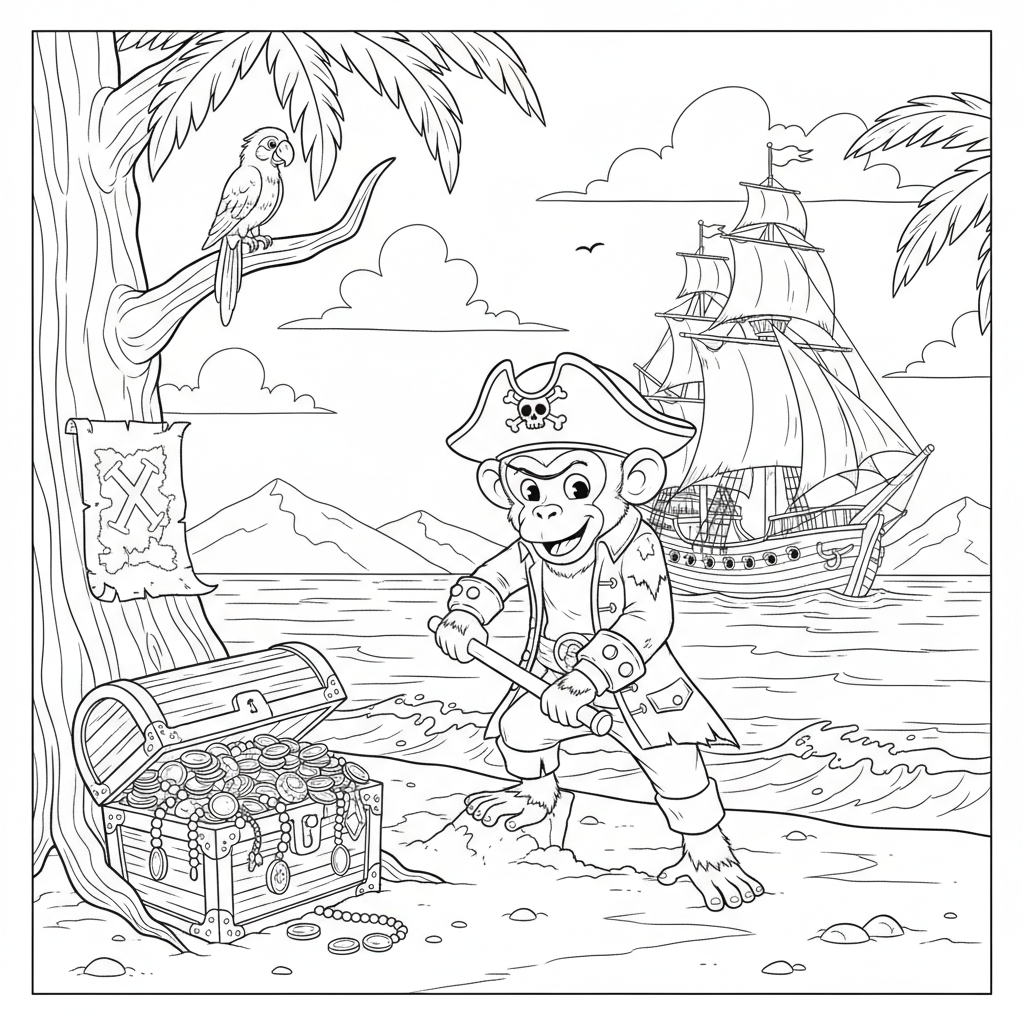 Beautiful monkey pirate treasure hunting coloring page for kids and adults. Free to download and print.