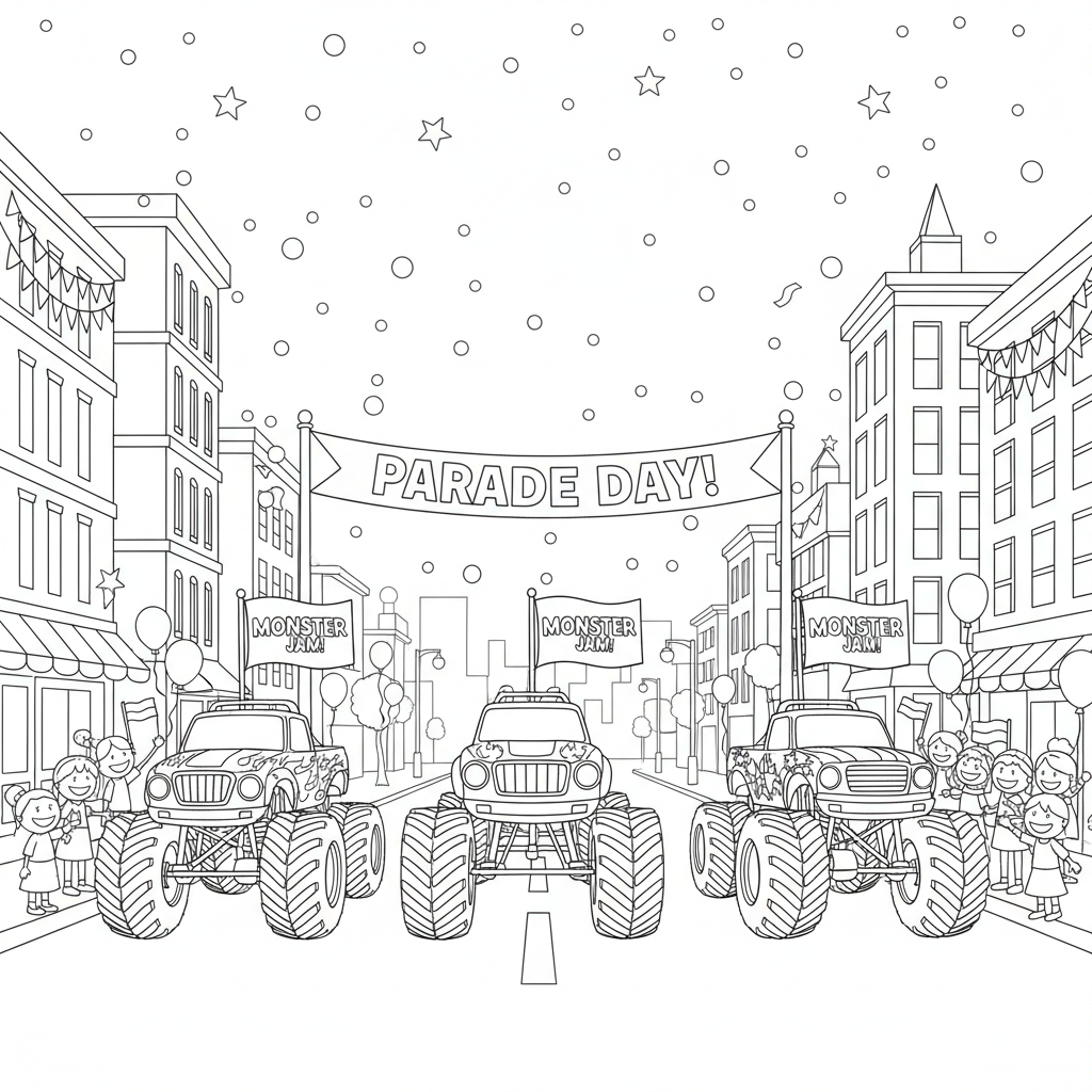 Epic monster truck coloring pages for all ages! From giant trucks crushing cars and doing wheelies to stadium freestyle shows and muddy off-road adventures. Print free monster truck coloring sheets featuring big wheels, jumps, and jaw-dropping stunts.