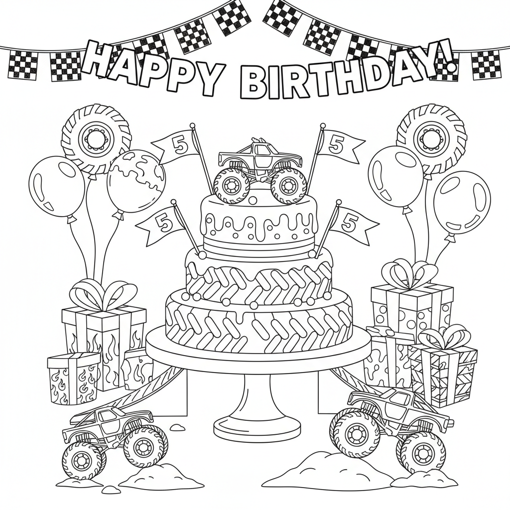 A delightful monster truck coloring page featuring a monster truck birthday party decoration and themed cake. Perfect for kids and adults who love coloring!