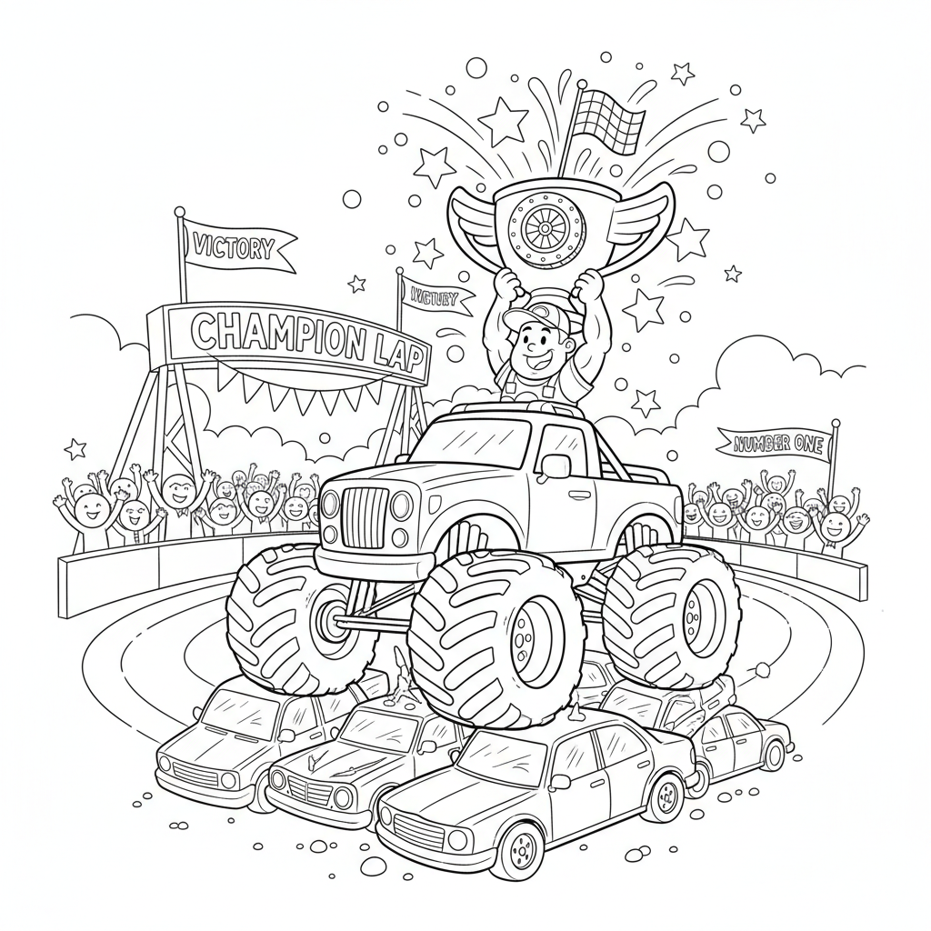 A delightful monster truck coloring page featuring a monster truck champion trophy celebration victory lap. Perfect for kids and adults who love coloring!