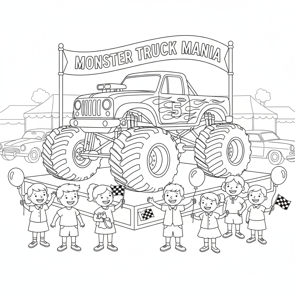 A delightful monster truck coloring page featuring a monster truck on display at a car show with fans. Perfect for kids and adults who love coloring!