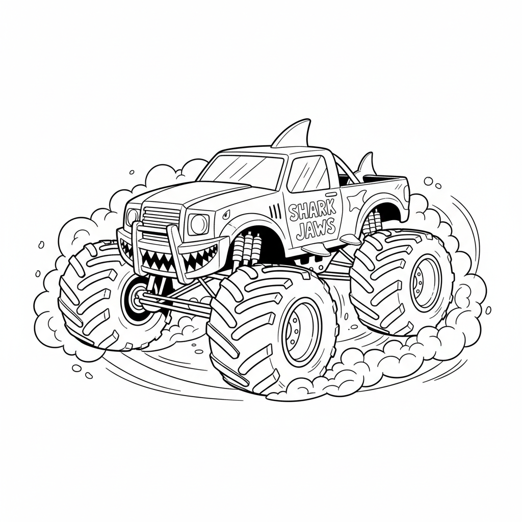 A delightful monster truck coloring page featuring a monster truck with shark teeth design doing donuts spinning. Perfect for kids and adults who love coloring!
