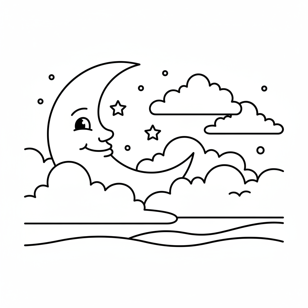 A delightful moon coloring page featuring moon and clouds night sky partially covered. Perfect for kids and adults who love coloring!