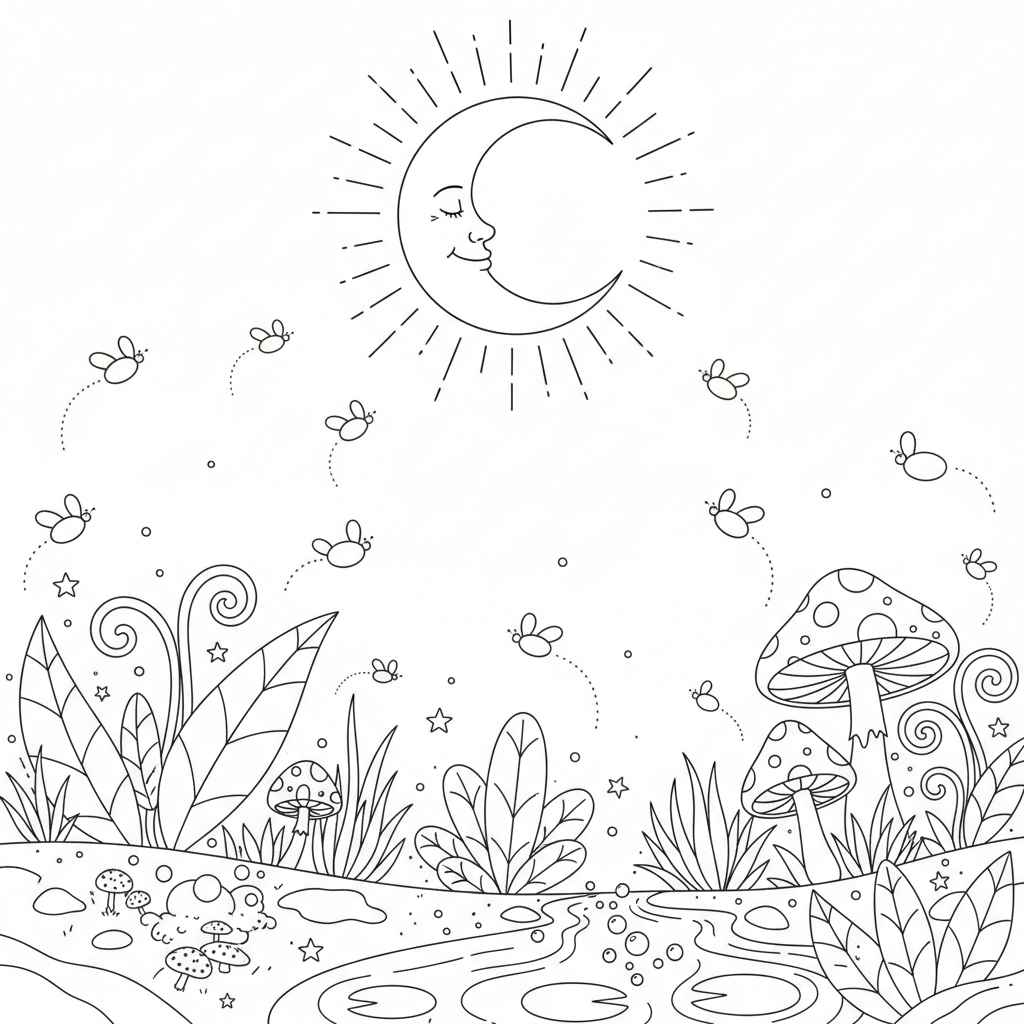 A delightful moon coloring page featuring moon and fireflies magical night scene glow. Perfect for kids and adults who love coloring!