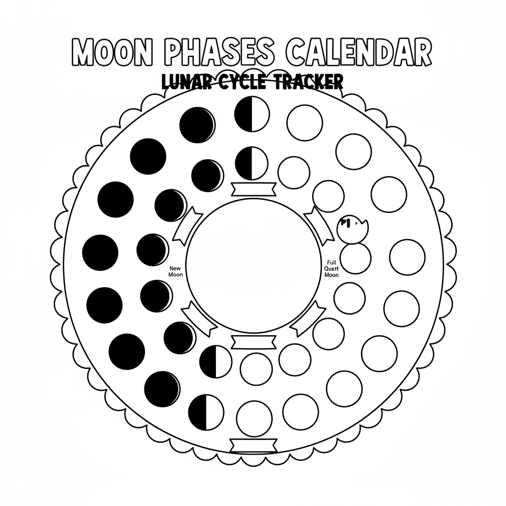 A delightful moon coloring page featuring moon phases calendar tracking lunar cycle. Perfect for kids and adults who love coloring!