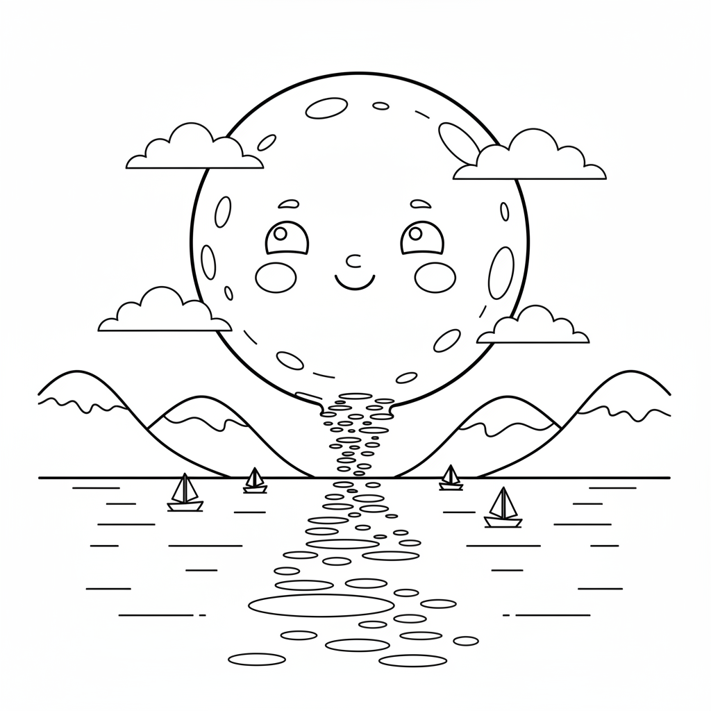 A delightful moon coloring page featuring moon reflecting on water lake ocean peaceful. Perfect for kids and adults who love coloring!