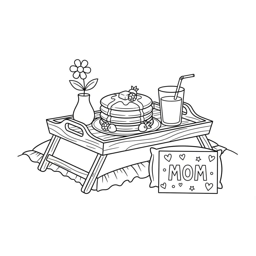 A delightful mother's day coloring page featuring breakfast in bed tray with pancakes juice and flower for mom. Perfect for kids and adults who love coloring!