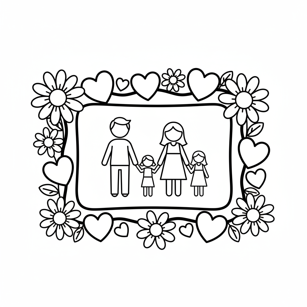 A delightful mother's day coloring page featuring family portrait frame decorated with hearts and daisies. Perfect for kids and adults who love coloring!