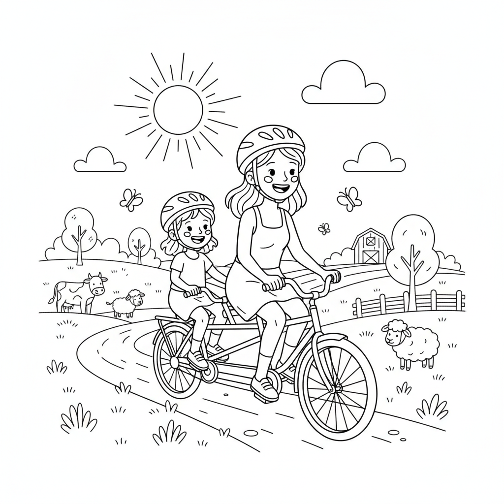 A delightful mother's day coloring page featuring mom and child riding bicycle together through countryside. Perfect for kids and adults who love coloring!