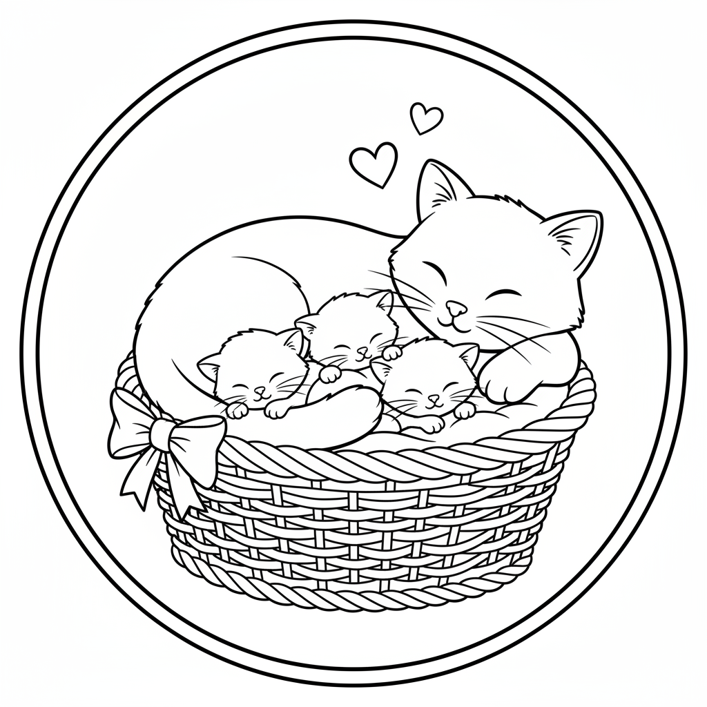 A delightful mother's day coloring page featuring mom cat cuddling baby kittens in basket sweet scene. Perfect for kids and adults who love coloring!